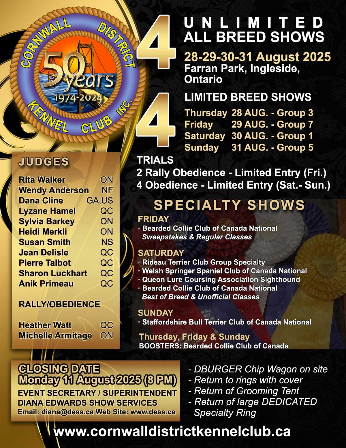 In 1977, the Club held it's first All Breed Championship Dog Show at the Cornwall Civic Complex. In 2002, the annual All Breed Championship Show moved outdoors for the first time at Farran Park, Ingleside, Ontario. The show returns to the area of the birthplace of the Club.